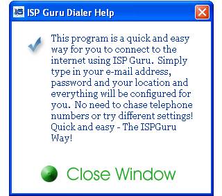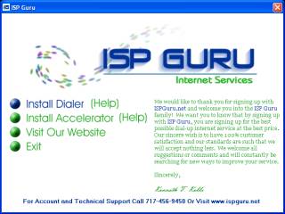 Comments: This menu starts automatically when the ISP Guru installation CDs are inserted into a computer. It provides helpful information using windows and an easy way to install the included programs. Clickable buttons also change colour from green to blue to show users that they can click on them.