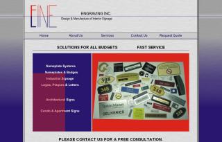 Comments: Uses a "brushed metal" background for the pages and an animated logo requested by the client. Visitors can see larger photographs of Fine Line Engraving's work by clicking on the photographs (which were supplied by the client) shown on the services page. A quote form allows visitors to request a quote from Fine Line Engraving. The homepage features an additional animated section requested by the client to list the services offered by the company.